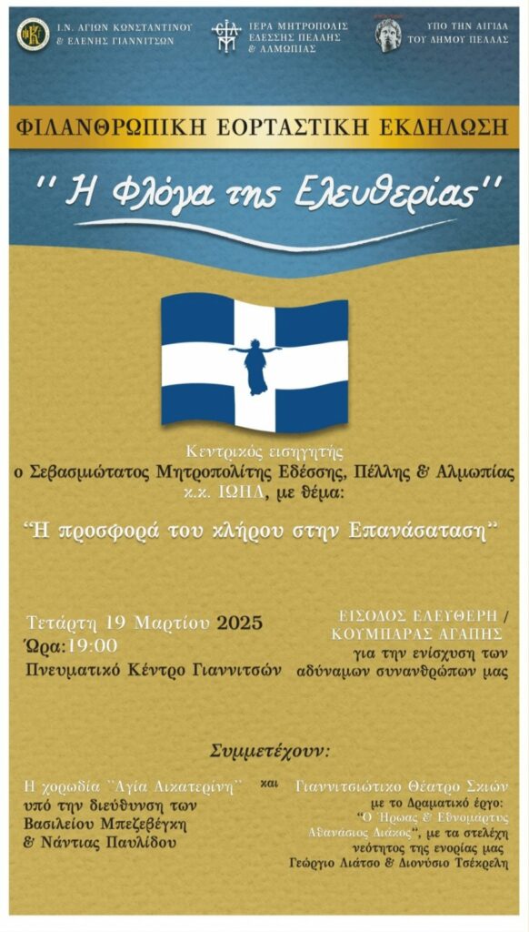 Την Τετάρτη 19 Μαρτίου και ώρα 7:00 μ.μ. στο Πνευματικό Κέντρο Γιαννιτσών η ενορία Αγίων Κωνσταντίνου και Ελένης Γιαννιτσών διοργανώνει υπό την αιγίδα του δήμου Πέλλας φιλανθρωπική εορταστική εκδήλωση με τίτλο: «Η Φλόγα της Ελευθερίας».