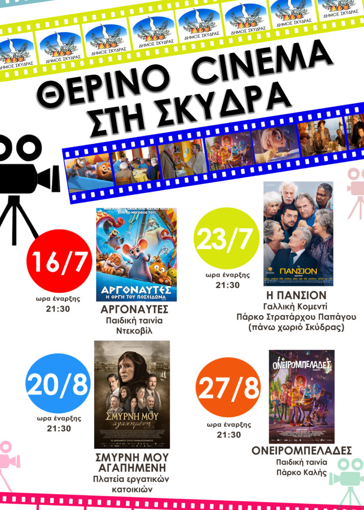 - Τετάρτη 23 Ιουλίου 2025. Τίτλος της ταινίας: Η πανσιόν. Γαλλική Κομεντί. Τόπος κι ώρα προβολής: Πάρκο Στρατάρχου Παπάγου, πάνω χωριό Σκύδρας, 21:30΄.