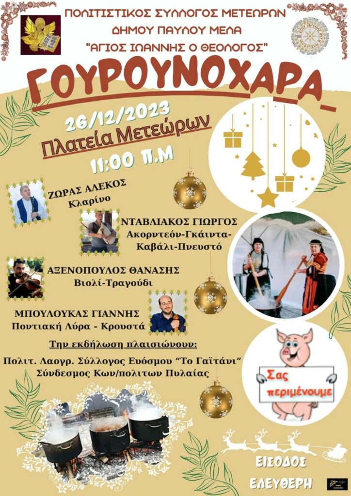 Την Τρίτη 26 Δεκεμβρίου 2023, στις 11:00, μικροί και μεγάλοι θα γλεντήσουν όλοι μαζί στην πλατεία Μετεώρων, όπου θα γίνει η αναβίωση της γιορτής της Γουρουνοχαράς.