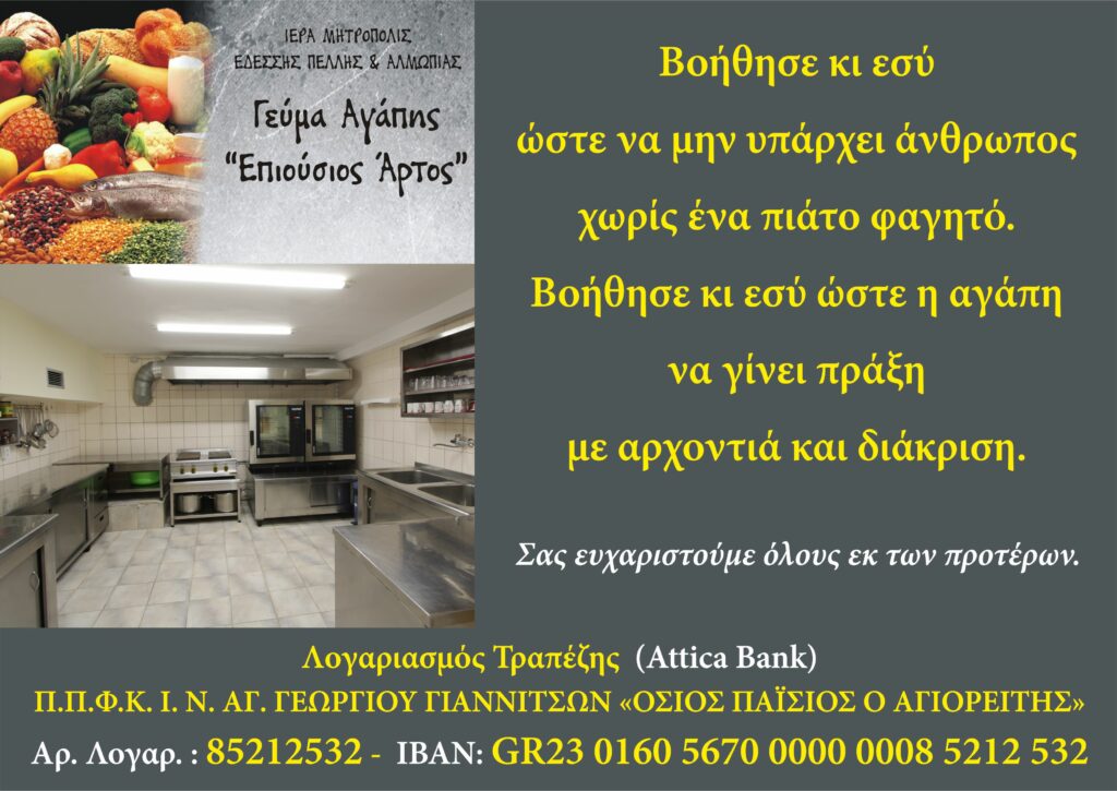 Το γεύμα αγάπης «Επιούσιος Άρτος» στα Γιαννιτσά, που τελεί υπό την ευλογία της Ιεράς Μητροπόλεως Εδέσσης, Πέλλης και Αλμωπίας, ενημερώνει ότι από 14 Αυγούστου λειτουργεί κανονικά προσφέροντας καθημερινά ένα ζεστό φαγητό σε 100 συνανθρώπους μας στη πόλη αλλά και στα γύρω χωριά της περιοχής. Η ανάγκη στήριξης του φιλανθρωπικού αυτού έργου αγάπης είναι σημαντική και ουσιαστική.