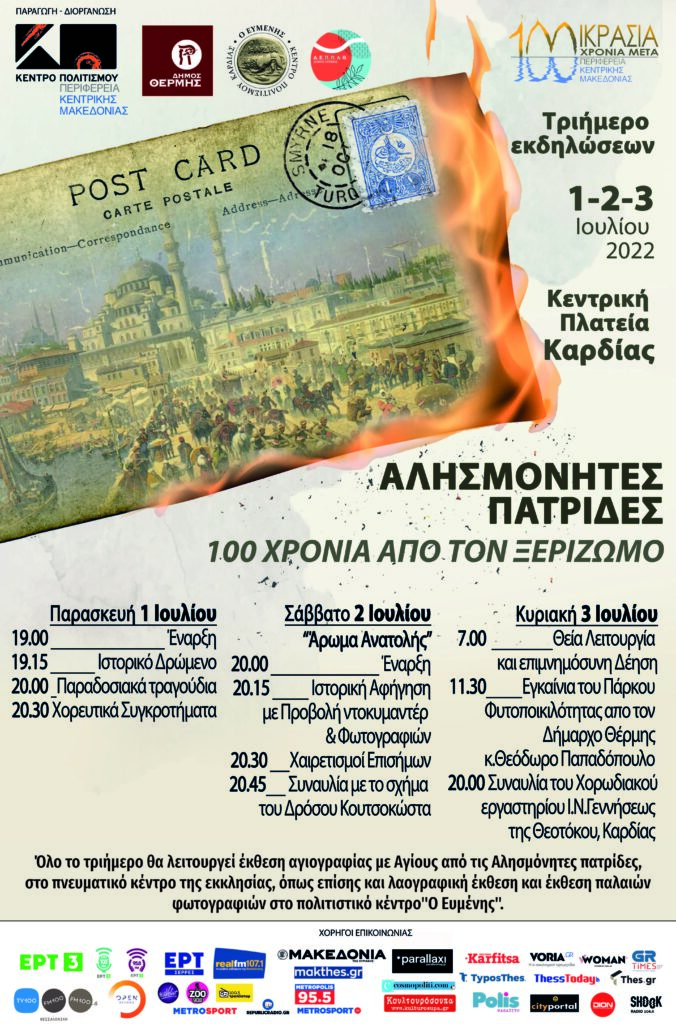 Συγκεκριμένα οι εκδηλώσεις που θα πραγματοποιηθούν στην κεντρική πλατεία της Καρδίας, θα ξεκινήσουν την Παρασκευή, 1 Ιουλίου, στις 19.00.Την έναρξη των εκδηλώσεων θα κηρύξει ο πρόεδρος της κοινότητας Ιωακείμ Τρικαλιάρης και θα ακολουθήσει ιστορικό δρώμενο από τον σύλλογο προσφύγων Ανατολικής Θράκης, Αγίας Τριάδας Θεσσαλονίκης. Πρόκειται για δραματοποιημένη αφήγηση όλων των δεινών που υπέστησαν οι εκπατρισθέντες Έλληνες από την Ανατολική Θράκη μέχρι την εγκατάσταση τους στην ελεύθερη Ελλάδα. Στη συνέχεια η χορωδία του ΚΑΠΗ Καρδίας, με χοράρχη τον Στέλιο Ζαχαρίου, Πρωτοψάλτη του Ι.Ν Αγίας Σοφίας Θεσσαλονίκης, θα παρουσιάσει παραδοσιακά τραγούδια από τις αλησμόνητες πατρίδες ενώ η Χαρούλα Στεργίου, θα τραγουδήσει μελοποιημένα ποιήματα της ιδίας, που αφορούν την προσφυγιά. Θα ακολουθήσουν τραγούδια της Ανατολικής Θράκης, της Προποντίδας,της Πόλης και των παραλίων της Μικράς Ασίας, από παραδοσιακή ορχήστρα και θα χορέψουν τα χορευτικά συγκροτήματα από το Πλαγιάρι του δήμου Θέρμης, το Πλαγιάρι Γιαννιτσών, και του πολιτιστικού κέντρου “Ευμένης” Καρδίας.