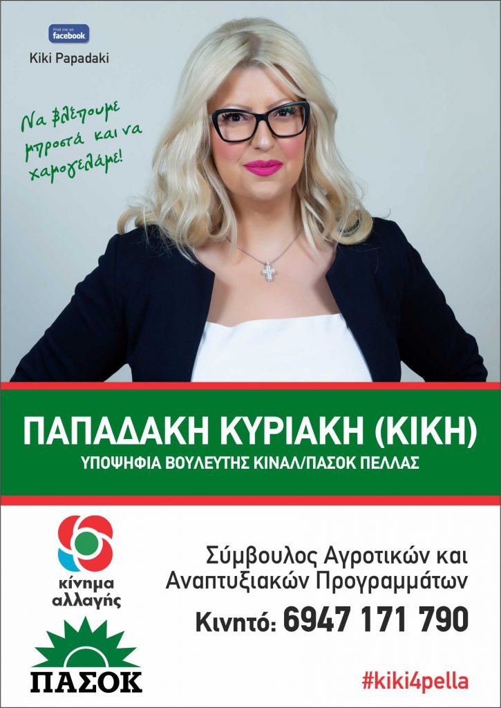 Από το πολιτικό γραφείο της υποψήφιας βουλευτή του ΚΙΝΑΛ – ΠΑΣΟΚ Πέλλας κας Κυριακής (Κική) Παπαδάκη, ανακοινώνονται τα εξής :