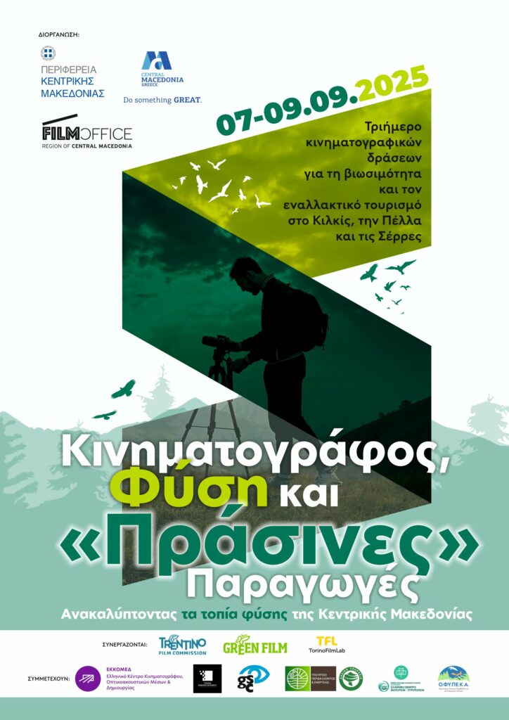 Με ξεχωριστές διεθνείς συμμετοχές και τη σύμπραξη κινηματογραφικών, εκπαιδευτικών και περιβαλλοντικών φορέων, η Διεύθυνση Τουρισμού και το Film Office της Περιφέρειας Κεντρικής Μακεδονίας διοργανώνουν τριήμερο δράσεων για τη βιωσιμότητα στον κινηματογράφο και τον εναλλακτικό τουρισμό, με θέμα «Κινηματογράφος, Φύση και “Πράσινες” Παραγωγές: Ανακαλύπτοντας τα τοπία φύσης της Κεντρικής Μακεδονίας».