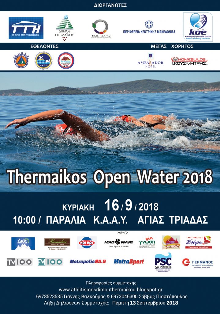 Η Περιφέρεια Κεντρικής Μακεδονίας, ο Δήμος Θερμαϊκού, μέσω του Τμήματος Αθλητισμού του ΔΗ.Π.Π.Α.Κ.Υ.Θ., και ο Κολυμβητικός Αθλητικός Όμιλος Θερμαϊκού (Κ.Α.Ο.Θ.) συνδιοργανώνουν για έκτη συνεχή χρονιά τον Κολυμβητικό Αγώνα Ανοιχτής Θάλασσας “Thermaikos Open Water 2018”. Ο αγώνας έχει τεθεί υπό την αιγίδα της Κολυμβητικής Ομοσπονδίας Ελλάδας (Κ.Ο.Ε.) και της Περιφερειακής Επιτροπής Κολύμβησης Κεντροδυτικής Μακεδονίας.