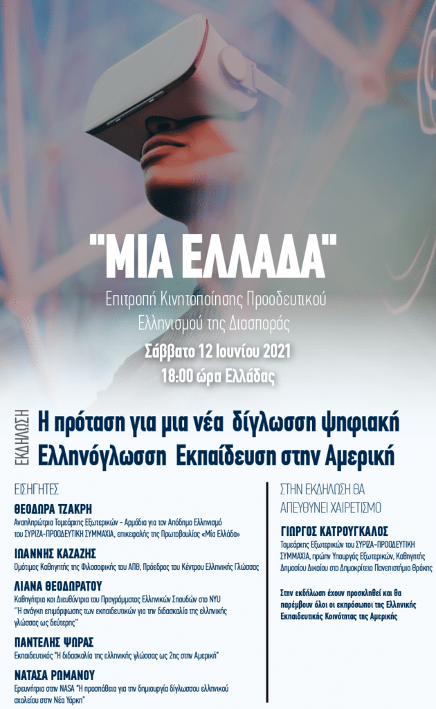 Με τη συμμετοχή της προέδρου του Ανώτατου Εκπαιδευτικού Συμβουλίου Αρχιεπισκοπής Αμερικής κ. Αθηνάς Κρομμύδα, της Πρόεδρου της Ομοσπονδίας Ελλήνων Εκπαιδευτικών Αμερικής κ. Στέλλας Κοκκόλη, Πανεπιστημιακών των Τμημάτων Ελληνικής Γλώσσας των Πανεπιστημίων της Αμερικής, εκπροσώπων φορέων της επιστημονικής ομογενειακής κοινότητας, του Δημάρχου των Tarpon Springs κ. Χρ. Αλαχούζου, των Διευθυντών των charter σχολείων της Αμερικής, στα οποία διδάσκεται η ελληνική γλώσσα και δεκάδων Ελλήνων και Ελληνίδων εκπαιδευτικών στα σχολεία της Αμερικής (σχολεία της Αρχιεπισκοπής, αμερικανικά δημόσια σχολεία, ανεξάρτητα σχολεία, charter σχολεία), Προέδρων Συλλόγων Γονέων και Κηδεμόνων των Ελληνικών Σχολείων κλπ πραγματοποιήθηκε το Σάββατο 12 Ιουνίου, μέσω ZOOM, η διαδικτυακή εκδήλωση της Επιτροπής Κινητοποίησης Προοδευτικού Ελληνισμού της Διασποράς «Μία Ελλάδα» με τίτλο: “ Η πρόταση για μια νέα δίγλωσση ψηφιακή Ελληνόγλωσση Εκπαίδευση στην Αμερική “.
