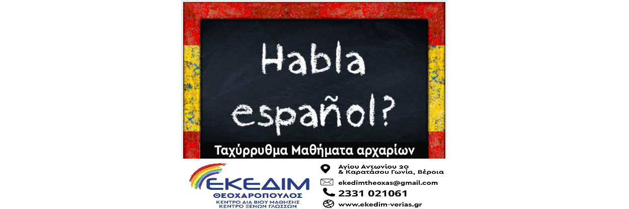 Το Κέντρο Δια Βίου Μάθησης-Κέντρο Ξένων Γλωσσών ΕΚΕΔΙΜ ΘΕΟΧΑΡΟΠΟΥΛΟΣ® οργανώνει και υλοποιεί, με εξειδικευμένες μεθόδους και σωστή ποιότητα εκπαίδευσης, ταχύρυθμο εξ αποστάσεως πρόγραμμα εκμάθησης Ισπανικών.