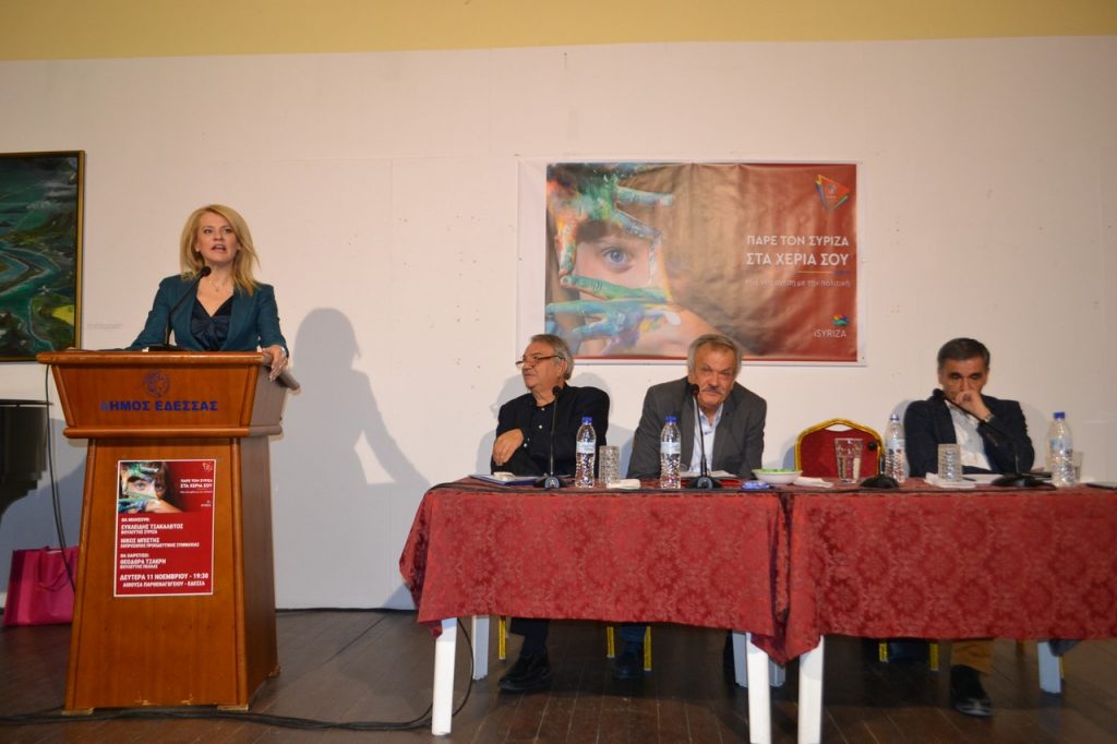 Την εκδήλωση άνοιξε ο συντονιστής της ΝΕ Πέλλας, σ. Πέτρος Γάγκλιου ο οποίος τόνισε την ανάγκη να συνδεθεί η κομματική βάση του ΣΥΡΙΖΑ με την εκλογική του βάση. Παίρνοντας το λόγο η σ. Θ. Τζάκρη εξέφρασε την ικανοποίησή της για τη μεγάλη ανταπόκριση των δημοκρατικών πολιτών του νομού μας στο κάλεσμα του ΣΥΡΙΖΑ κα την αναγκαιότητα συστράτευσης όλων των δημοκρατικών δυνάμεων στον αγώνα εναντίον των οργανωμένων οικονομικών συμφερόντων που υπερασπίζεται η ιδιωτική Κυβέρνηση Μητσοτάκη.