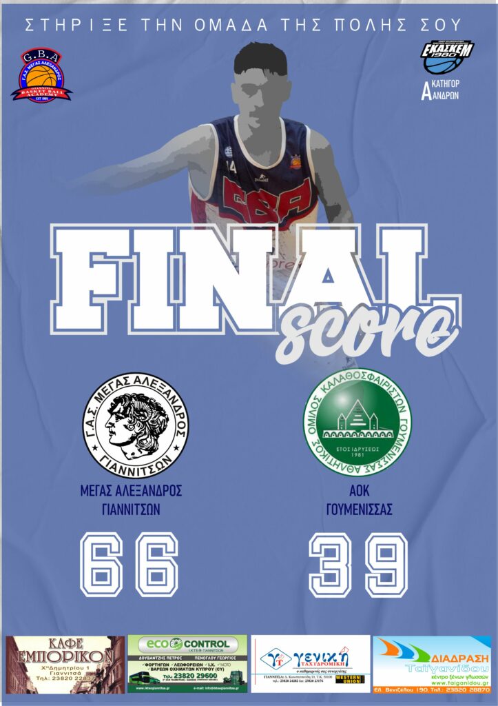 Με νίκη συνέχισε της αγωνιστικές του υποχρεώσεις το ανδρικό τμήμα του «Μ. Αλεξάνδρου» για το πρωτάθλημα της Ε.ΚΑ.Σ.ΚΕ.Μ., κερδίζοντας το Σάββατο 19/11/2022 στο κλειστό γυμναστήριο των Γιαννιτσών την αντίστοιχη ομάδα της Γουμένισσας με σκορ 66-39.