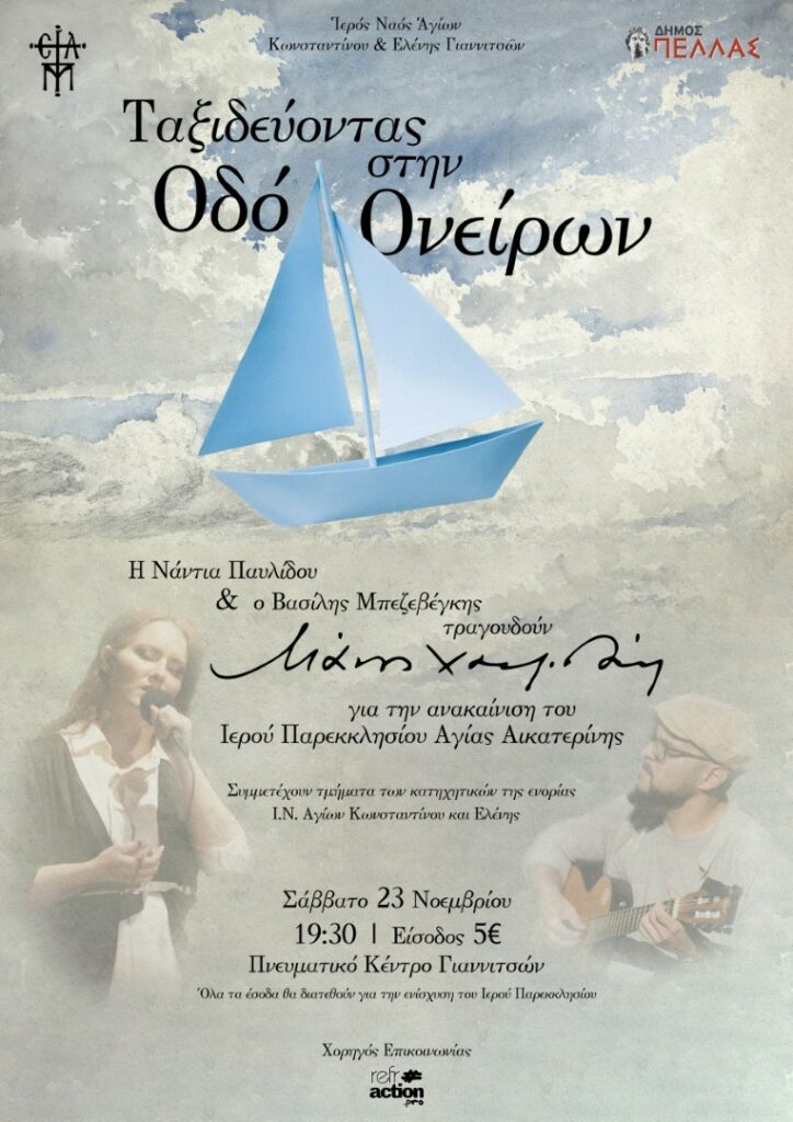 Στα πλαίσια του εορτασμού του Παρεκκλησίου της Αγίας Αικατερίνης η ενορία Αγίων Κωνσταντίνου και Ελένης Γιαννιτσών διοργανώνει το Σάββατο 23 Νοεμβρίου, στις 19.30, μουσική εκδήλωση με τίτλο: «Ταξιδεύοντας στην Οδό Ονείρων». Η Νάντια Παυλίδου και ο Βασίλης Μπεζεβέγκης θα αποδώσουν έργα του Μάνου Χατζηδάκη, ενώ θα συμμετέχουν και τμήματα των κατηχητικών της ενορίας.