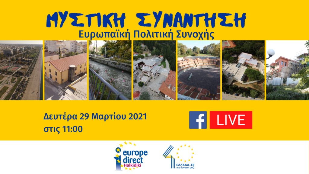 Το Κέντρο Ευρωπαϊκής Πληροφόρησης Europe Direct Halkidiki διοργανώνει την διαδικτυακή εκδήλωση με τίτλο «ΜΥΣΤΙΚΗ ΣΥΝΑΝΤΗΣΗ Ευρωπαϊκή Πολιτική Συνοχής» που θα πραγματοποιηθεί στις 29 Μαρτίου 2021 και ώρα 11:00.