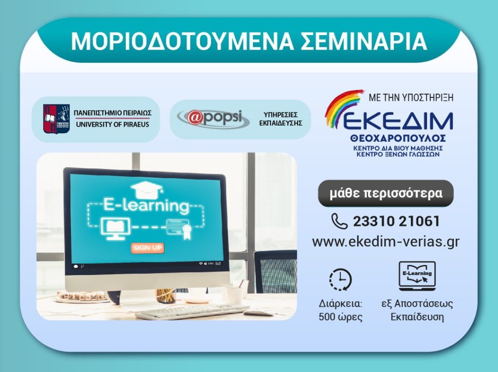 Το ΚΕΔΙΒΙΜ του Πανεπιστημίου Πειραιώς, σε συνεργασία με τον τον Εκπαιδευτικό Όμιλο ΑΠΟΨΗ, οργανώνει και υλοποιεί τα εξής επιμορφωτικά προγράμματα: