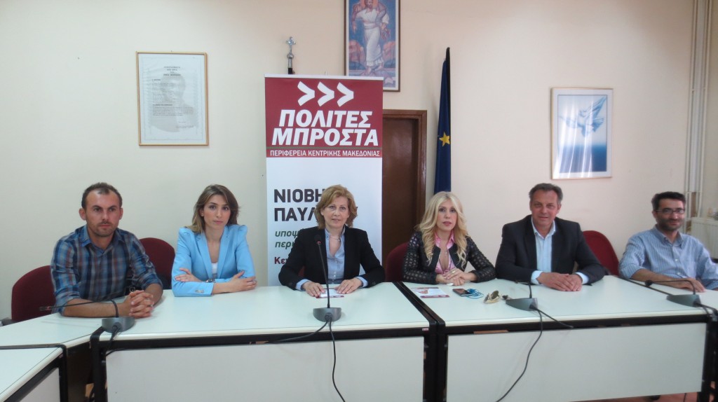Στη συνέντευξη τύπου η κα Παυλίδου παρουσίασε την υποψήφια αντιπεριφερειάρχι Χαλκιδικής Ρούλα Μυκωνιάτη και τους υποψήφιους περιφερειακούς συμβούλους για την περιφερειακή ενότητα Χαλκιδικής.