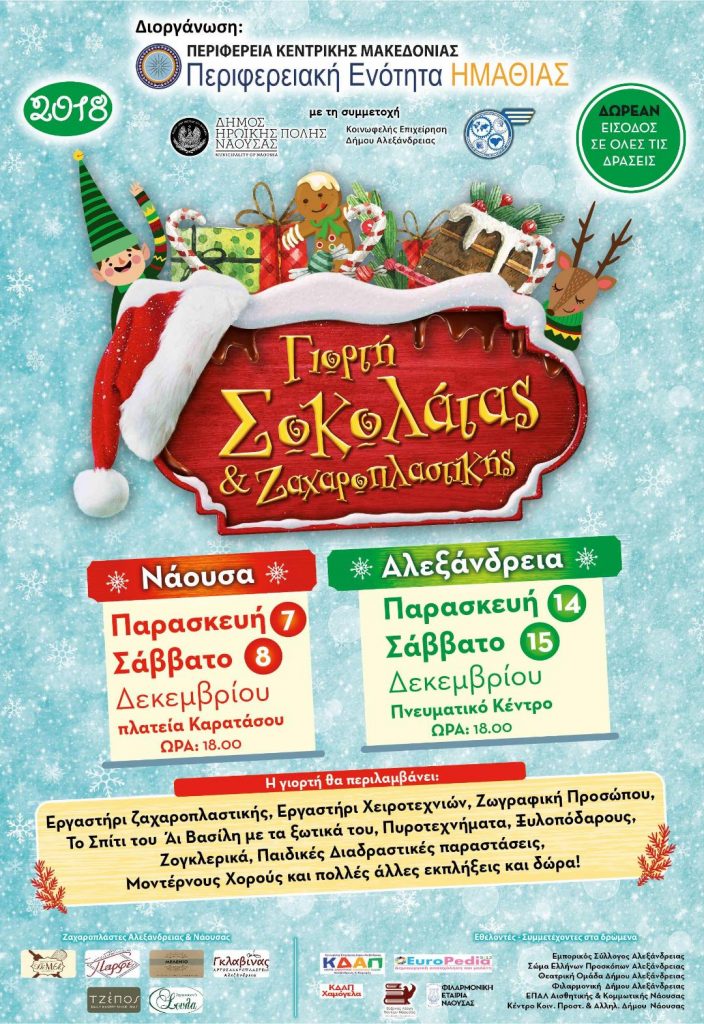 Ο Άγιος Βασίλης και τα ξωτικά του ταξιδεύουν φέτος στη Νάουσα και την Αλεξάνδρεια και υπόσχονται να μοιράσουν χιλιάδες γλυκίσματα και αμέτρητα χαμόγελα σε μικρούς και μεγάλους στην Γιορτή Σοκολάτας και Ζαχαροπλαστικής που διοργανώνει η Π.Ε. Ημαθίας!