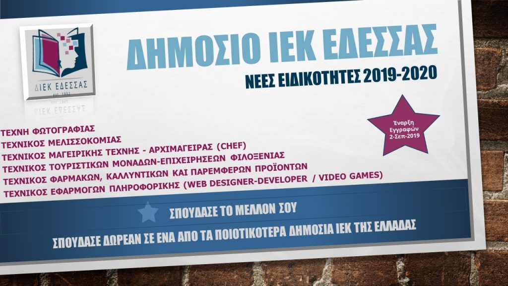 Το Δημόσιο ΙΕΚ Έδεσσας παραμένοντας ο ποιοτικότερος δημόσιος φορέας παροχής ΔΩΡΕΑΝ και άρτια οργανωμένης αρχικής επαγγελματικής κατάρτισης στο Ν. Πέλλας, σας ενημερώνει για τις Νέες Ειδικότητες που θα λειτουργήσουν το ακαδημαϊκό έτος 2019-2020: