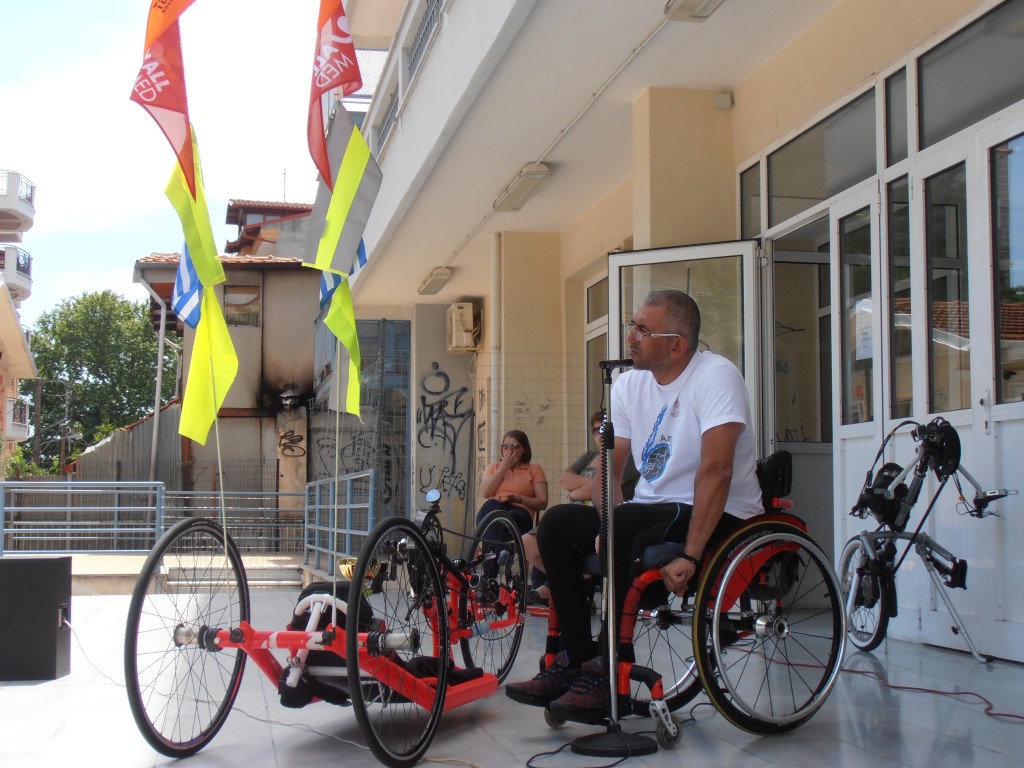 Γρήγορα ξεκίνησε η ομιλία που αφορούσε στο ατύχημα του και ότι επακολούθησε μετά από αυτό, για τον αγώνα που έδωσε για την ζωή ,την στήριξη που είχε από τους δικούς του ανθρώπους αλλά και την θέληση και την δύναμη ψυχής που τον οδήγησαν σε σύντομο χρονικό διάστημα να γίνει Πρωταθλητής Ελλάδος και Ευρώπης στην κατηγορία του και να προετοιμάζεται για την συμμετοχή του στο Παγκόσμιο κύπελλο. Μας μίλησε για τις δυσκολίες που αντιμετωπίζει ως άτομο με αναπηρία τόσο στις μετακινήσεις του στην πόλη όσο και στην προπόνηση που κάνει καθημερινά με το ειδικό του ποδήλατο. Μίλησε στα παιδιά για τα μέτρα ασφαλείας που θα πρέπει να παίρνουν κάνοντας ποδήλατο στους δρόμους αλλά και πώς να συμπεριφέρονται απέναντι σε άτομα με ειδικές ανάγκες. Στην συνέχεια ακολούθησαν δεκάδες ερωτήσεις μαθητών στις οποίες απάντησε με μεγάλη ευχαρίστηση στην συνέχεια τα παιδιά πήγαν κοντά του να τον χαιρετίσουν, να δουν το ποδήλατο με το οποίο αγωνίζεται αλλά και το Πανευρωπαϊκό Κύπελλο που κατέκτησε στην Πράγα .