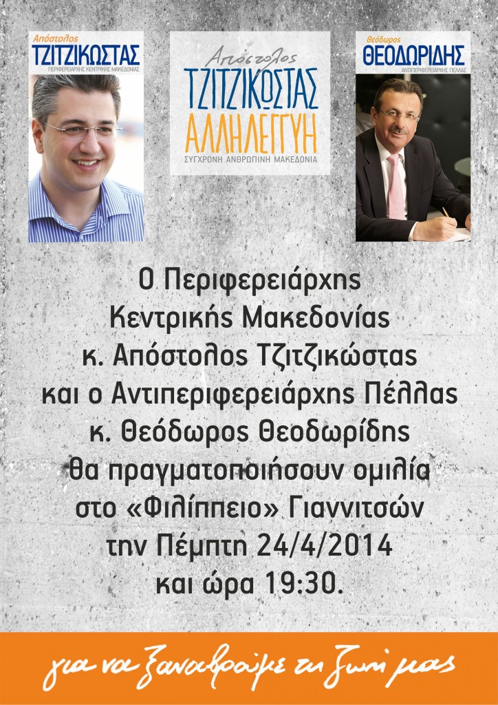 Παράλληλα ο Περιφερειάρχης Κεντρικής Μακεδονίας και ο Αντιπεριφερειάρχης Πέλλας θα πραγματοποιήσουν ομιλία στις 19:30 στο «Φιλίππειο» των Γιαννιτσών.
