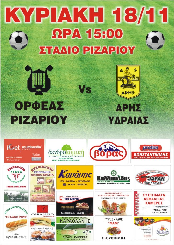 ΟΡΦΕΑΣ ΡΙΖΑΡΙΟΥ – ΑΡΗΣ ΥΔΡΑΙΑΣ Κυριακή 18/11