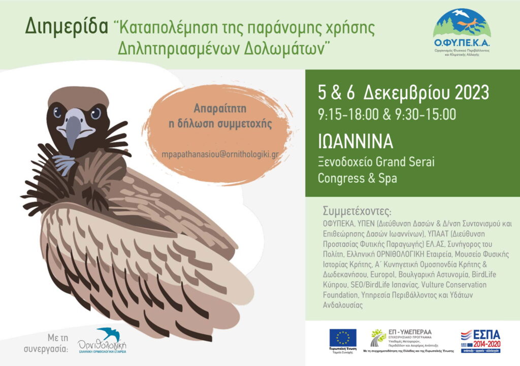 Aθήνα, Πέμπτη 30 Νοεμβρίου 2023 – Διημερίδα με τίτλο «Καταπολέμηση της παράνομης χρήσης Δηλητηριασμένων Δολωμάτων στην Ελλάδα» διοργανώνει στις 5 και 6 Δεκεμβρίου, στα Γιάννενα, ο Οργανισμός Φυσικού Περιβάλλοντος και Κλιματικής Αλλαγής (ΟΦΥΠΕΚΑ) σε συνεργασία με την Ελληνική Ορνιθολογική Εταιρία.