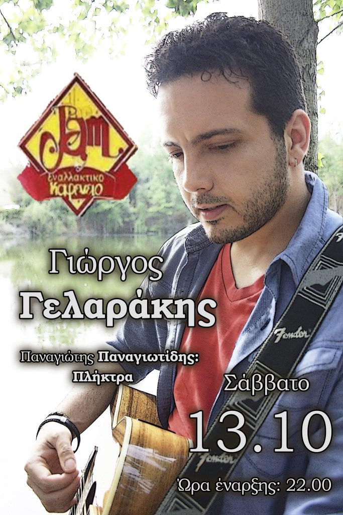 Ο Γιώργος Γελαράκης συνεχίζει την χειμερινή του περιοδεία και εμφανίζεται στο καλλιτεχνικό καφενείο The jam, στην Έδεσσα στις 13 Οκτωβρίου! Μια βραδιά με αμεσότητα, με πολύ ρυθμό, έντεχνες, swing, reggae κ.ά. πινελιές από το χτες και το σήμερα, με σκοπό να τραγουδήσουμε όλοι μαζί και να γίνουμε μια παρέα!