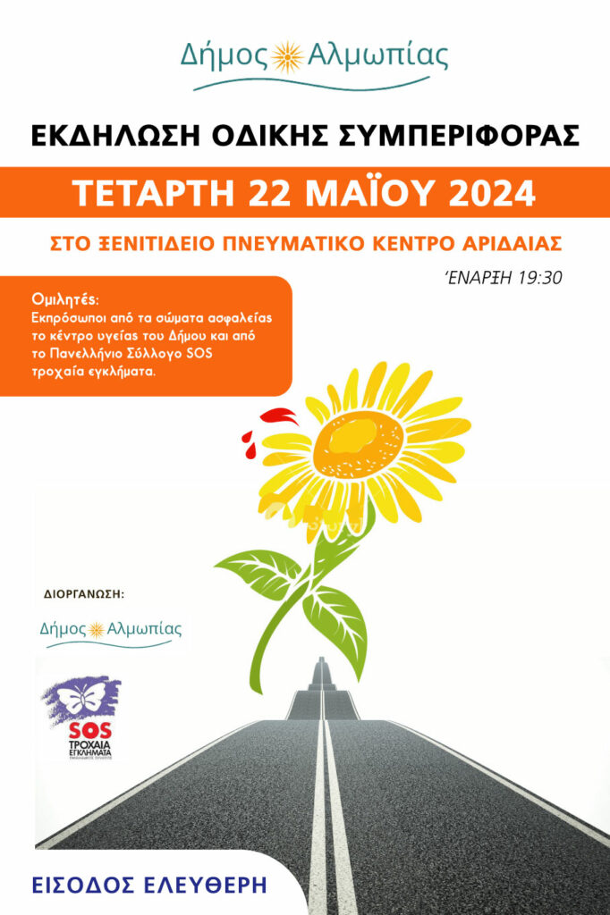 Mε το σύνθημα ΄΄H Ζωή είναι ωραία λέμε Όχι στα τροχαία ΄΄ , το επιστημονικό προσωπικό των Kοινωνικών Yπηρεσιών του Δήμου (Βοήθεια στο Σπίτι , Κέντρου Κοινότητας) καθώς και του Κέντρου Υγείας , θα ενημερώνουν για την οδική ασφάλεια πεζών και οδηγών με έντυπο υλικό και προσκλήσεις για την εκδήλωση στον γενικό πληθυσμό, στην Αριδαία την Παρασκευή 17 και την Τετάρτη 22 Μάιου και στον Εξαπλάτανο την Τρίτη 21 Μάιου.