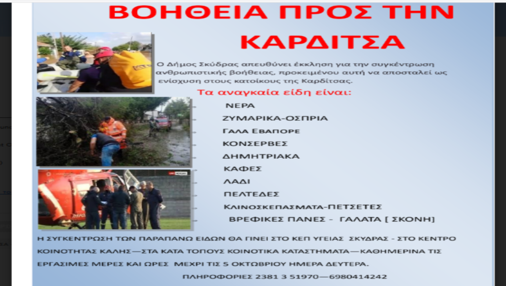 Σ΄ επικοινωνία του Δήμου Σκύδρας με το Δήμο Καρδίτσας προέκυψε ότι υπάρχει μεγάλη ανάγκη για κλινοσκεπάσματα – πετσέτες, είδη διατροφής και καθαριότητας μακράς διάρκειας, δηλαδή νερά, συσκευασμένα τρόφιμα, είδη υγιεινής κ.α.