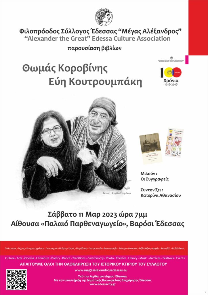 Τα βιβλία «Μπέμπης», μυθιστόρημα, εκδ.Άγρας (2022) του Θωμά Κοροβίνη και «Το τρίτο πόδι», μυθιστόρημα, εκδ.Ενύπνιο (2021) της Εύης Κουτρουμπάκη, θα παρουσιάσει ο Φιλοπρόοδος Σύλλογος Έδεσσας «Μέγας Αλέξανδρος», το Σάββατο 11 Μαρτίου 2023, στις 7 το απόγευμα, στο Παρθεναγωγείο (Βαρόσι, Έδεσσα).