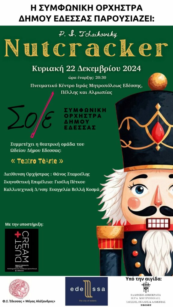 Την Κυριακή 22 Δεκεμβρίου στις 8:00 μ.μ. στο Πνευματικό Κέντρο της Ιεράς Μητροπόλεως (απέναντι από τον Ψηλό Βράχο) η Συμφωνική Ορχήστρα του Δήμου Εδέσσης θα παρουσιάσει το έργο του Τσαϊκόφσκι «Καρυοθραύστης».