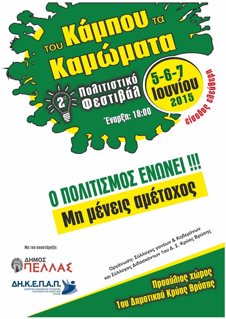 Με κεντρικό σύνθημα “Ο Πολιτισμός Ενώνει. Μη μένεις αμέτοχος” ο Σύλλογος Γονέων και Κηδεμόνων και ο Σύλλογος Διδασκόντων του 1ου Δημοτικού Σχολείου Κρύας Βρύσης, διοργανώνουν ένα διαφορετικό πολιτιστικό φεστιβάλ το τριήμερο 5, 6 και 7 Ιουνίου στον προαύλιο χώρο του 1ου Δημοτικού Σχολείου Κρύας Βρύσης (Ελευθερίου Βενιζέλου με Μεταξά γωνία στην Κρύα Βρύση) με την τίτλο “του Κάμπου τα καμώματα”. Στο φεστιβάλ, το οποίο να αναμένεται να παρακολουθήσει πλήθος κόσμου, συμμετέχουν σχολεία, αλλά και φορείς από όλη την Περιφερειακή Ενότητα Πέλλας και συγκεκριμένα συμμετέχουν από Αριδαία, Έδεσσα, Γιαννιτσά, Κρύα Βρύση, Ακρολίμνη, Γαλατάδες κ.α.