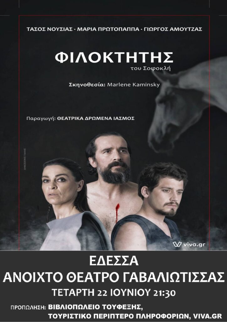 Τα Θεατρικά Δρώμενα «ΙΑΣΜΟΣ» θα παρουσιάσουν το Καλοκαίρι του 2022 την τραγωδία του Σοφοκλή «Φιλοκτήτης» σε επιλεγμένα θέατρα και Φεστιβάλ της Ελλάδας & της Κύπρου. Τον απαιτητικό ρόλο του πληγωμένου ομώνυμου ήρωα ερμηνεύει ο Τάσος Νούσιας, αυτόν του φιλόδοξου Νεοπτόλεμου αναλαμβάνει ο πολλά υποσχόμενος Γιώργος Αμούτζας, ενώ στον ρόλο-πρόκληση του πολυμήχανου Οδυσσέα βρίσκουμε την Μαρία Πρωτόπαππα. Μαζί τους ένας 6μελής χορός ταλαντούχων ηθοποιών.