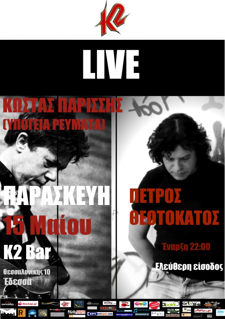 Στα πλαίσια της ακουστικής περιοδείας τους στη Βόρεια Ελλάδα, θα εμφανιστούν στο Κ2 Bar στην Έδεσσα την Παρασκευή 15 Μαϊου.