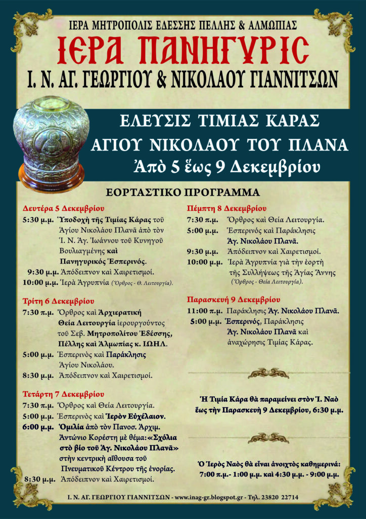 Την Τρίτη 6 Δεκεμβρίου πανηγυρίζει ο Ιερός Ναός Αγίων Γεωργίου και Νικολάου Γιαννιτσών. Στα πλαίσια του εορτασμού θα τεθεί σε προσκύνηση η Τιμία Κάρα του Αγίου Νικολάου του Πλανά, η οποία αποθησαυρίζεται στον Ιερό Ναό Αγίου Ιωάννου του Κυνηγού Βουλιαγμένης και θα μεταφερθεί στην Ιερά Μητρόπολη Εδέσσης με την ευλογία του Μακαριωτάτου Αρχιεπισκόπου Αθηνών και πάσης Ελλάδος κ. Ιερωνύμου.