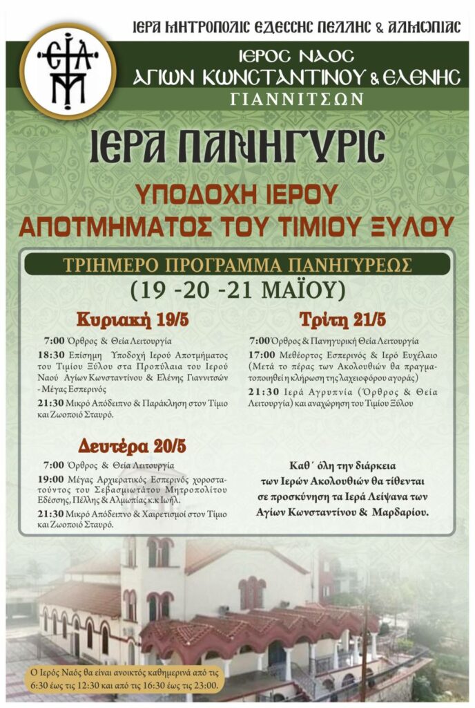 6:30 μ.μ. Επίσημη Υποδοχή του Τιμίου Ξύλου στα Προπύλαια του Ι. Ναού Αγίων Κωνσταντίνου και Ελένης Γιαννιτσών – Μέγας Εσπερινός