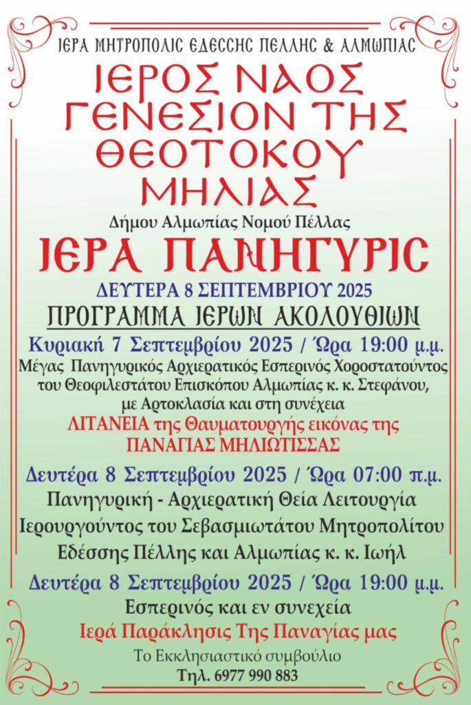 Την Δευτέρα 8 Σεπτεμβρίου πανηγυρίζει ο ιερός ενοριακός ναός Γενεσίου της Θεοτόκου στην Μηλιά Αλμωπίας σύμφωνα με το εξής πρόγραμμα: