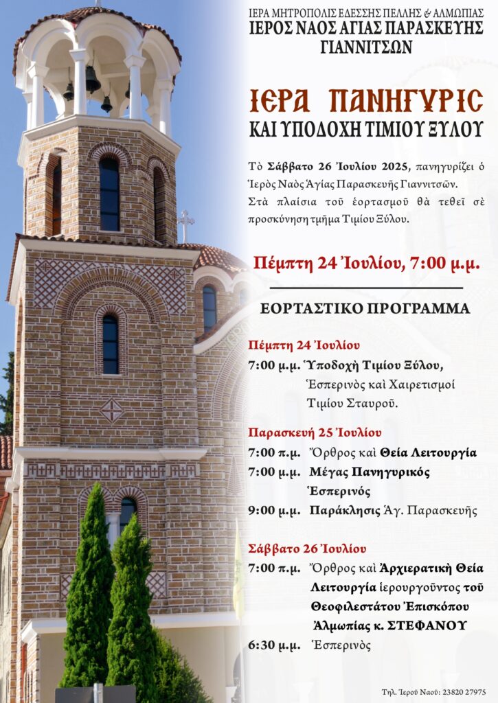 Το Σάββατο 26 Ιουλίου 2025 πανηγυρίζει ο Ιερός Ναός Αγίας Παρασκευής Γιαννιτσών. Στα πλαίσια του εορτασμού θα τεθεί σε προσκύνηση τμήμα του Τιμίου Ξύλου.