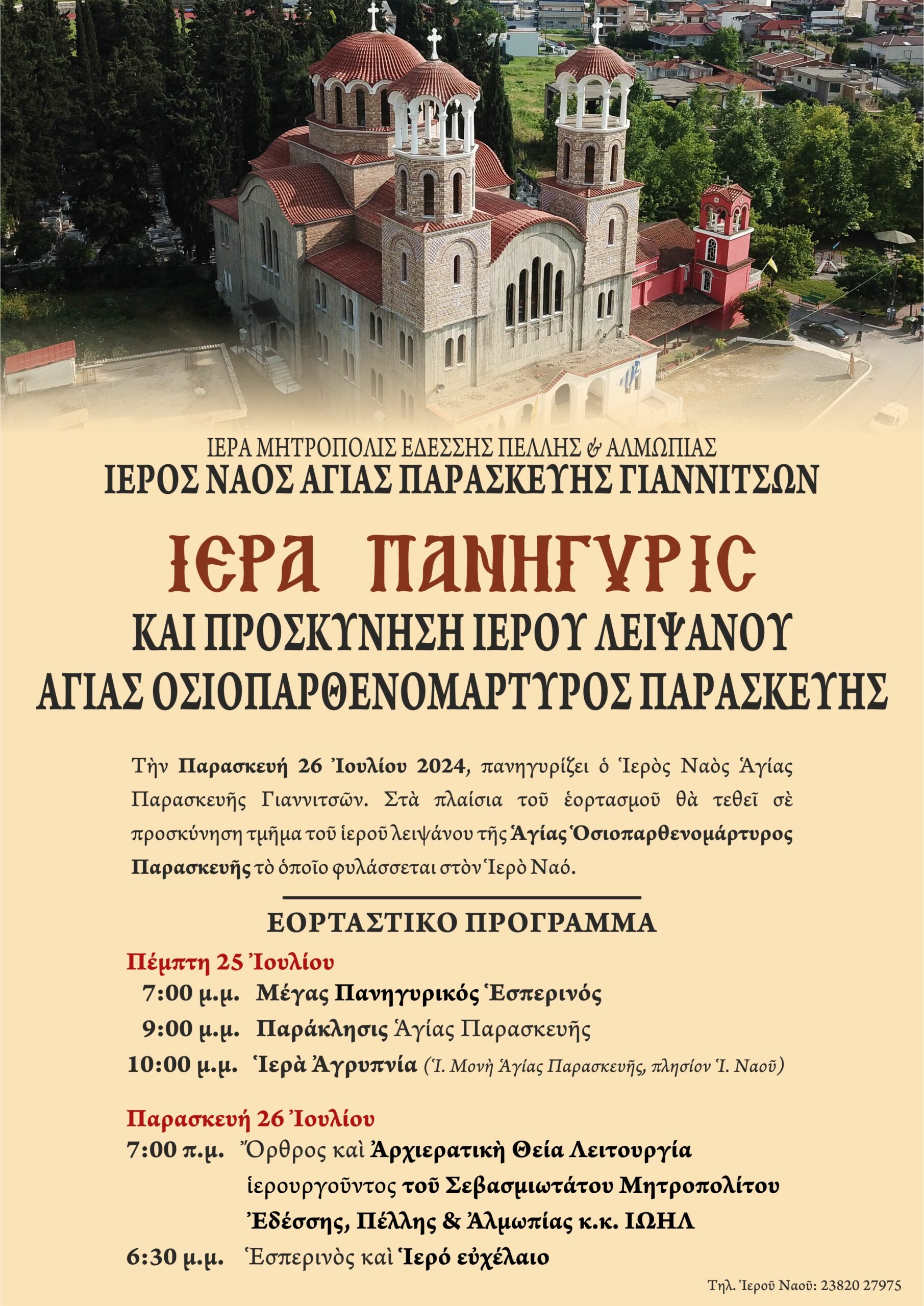Την Παρασκευή 26 Ιουλίου 2024 πανηγυρίζει ο Ιερός Ναός Αγίας Παρασκευής Γιαννιτσών. Στα πλαίσια του εορτασμού θα τεθεί σε προσκύνηση τμήμα του ιερού λειψάνου της Αγίας Οσιοπαρθενομάρτυρος Παρασκευής, το οποίο φυλάσσεται στον Ιερό Ναό.