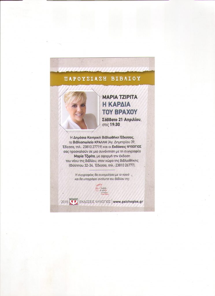 Η Δημόσια Κεντρική Βιβλιοθήκη Έδεσσας σας προσκαλεί το Σάββατο 21 Απριλίου και ώρα 19.30 στο χώρο της Βιβλιοθήκης (Φιλίππου 32-34) σε μια συνάντηση με τη συγγραφέα Μαρία Τζιρίτα, με αφορμή την έκδοση του νέου της βιβλίου.