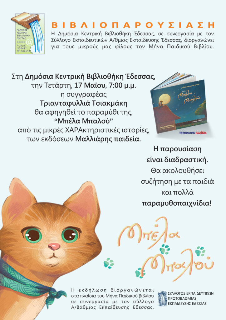 Η Δημόσια Κεντρική Βιβλιοθήκη Έδεσσας σε συνεργασία με τον Σύλλογο Εκπαιδευτικών Πρωτοβάθμιας Εκπαίδευσης Έδεσσας στα πλαίσια του Μήνα Παιδικού Βιβλίου με μεγάλη χαρά σας προσκαλούν στην παρουσίαση του παιδικού βιβλίου «Μπέλα Μπαλού» της Τριανταφυλλένιας Τσιακμάκη την Τετάρτη 17 Μαΐου, ώρα 7 μ.μ. στην Δημόσια Κεντρική Βιβλιοθήκη Έδεσσας