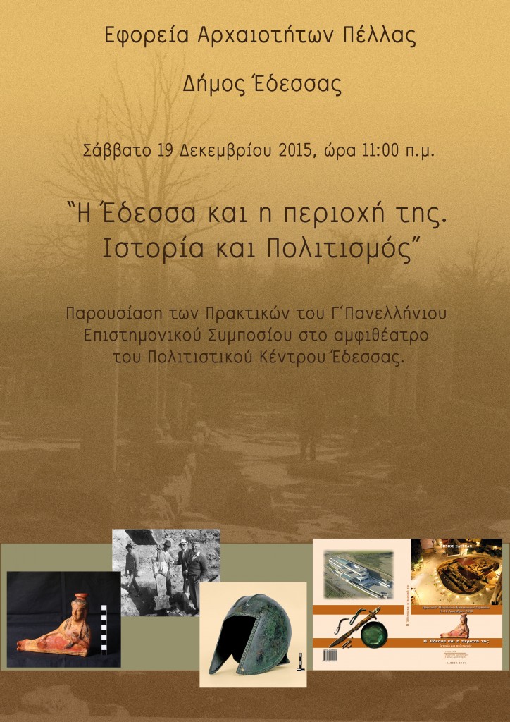 Ο Δήμος Έδεσσας και η Εφορεία Αρχαιοτήτων Πέλλας διοργανώνουν παρουσίαση των Πρακτικών του Γ’ Πανελλήνιου Επιστημονικού Συμποσίου, με τίτλο «Η Έδεσσα και η περιοχή της. Ιστορία και Πολιτισμός».