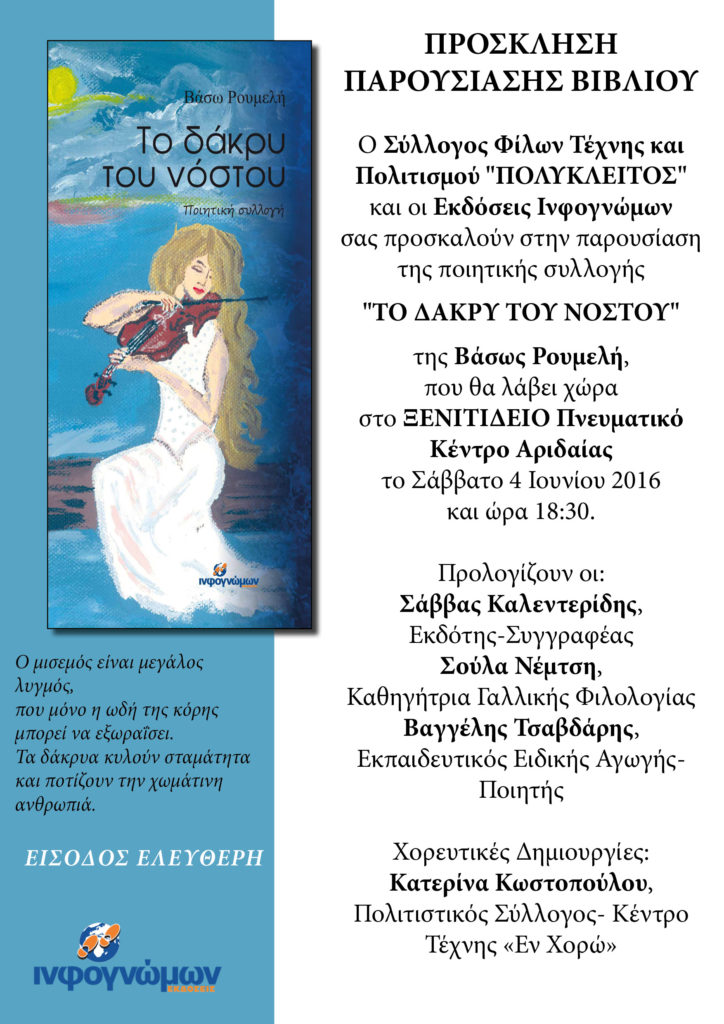 Παρουσίαση της ποιητικής συλλογής “ΤΟ ΔΑΚΡΥ ΤΟΥ ΝΟΣΤΟΥ” θα παρουσιαστεί το Σάββατο 4 Ιουνίου 2016 στις 6:30 στο Ξενιτείδιο Αριδαίας