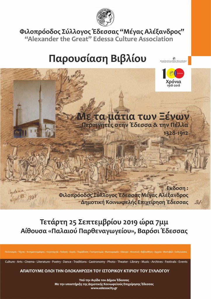 Περιηγητές στην Έδεσσα και την Πέλλα, 1328-1912», που εξέδωσε πρόσφατα ο Φ.Σ.Ε. «Μέγας Αλέξανδρος», θα γίνει την Τετάρτη 25 Σεπτεμβρίου 2019 και ώρα 7 μ.μ., στο Παρθεναγωγείο (Βαρόσι Έδεσσας).