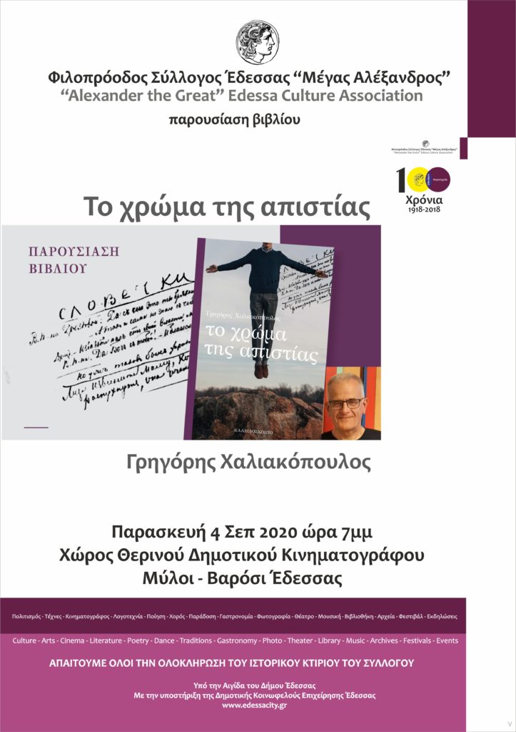 Ο Φιλοπρόοδος Σύλλογος Έδεσσας «Μέγας Αλέξανδρος» προσκαλεί το φιλαναγνωστικό κοινό στην εκδήλωση παρουσίασης του νέου βιβλίου του συγγραφέα-δημοσιογράφου Γρηγόρη Χαλιακόπουλου, «Το χρώμα της απιστίας» (εκδ. Καλειδοσκόπιο). Η εκδήλωση πραγματοποιείται την Παρασκευή 4 Σεπτεμβρίου 2020 και ώρα 7 το απόγευμα, στο χώρο του θερινού σινεμά στην Έδεσσα.