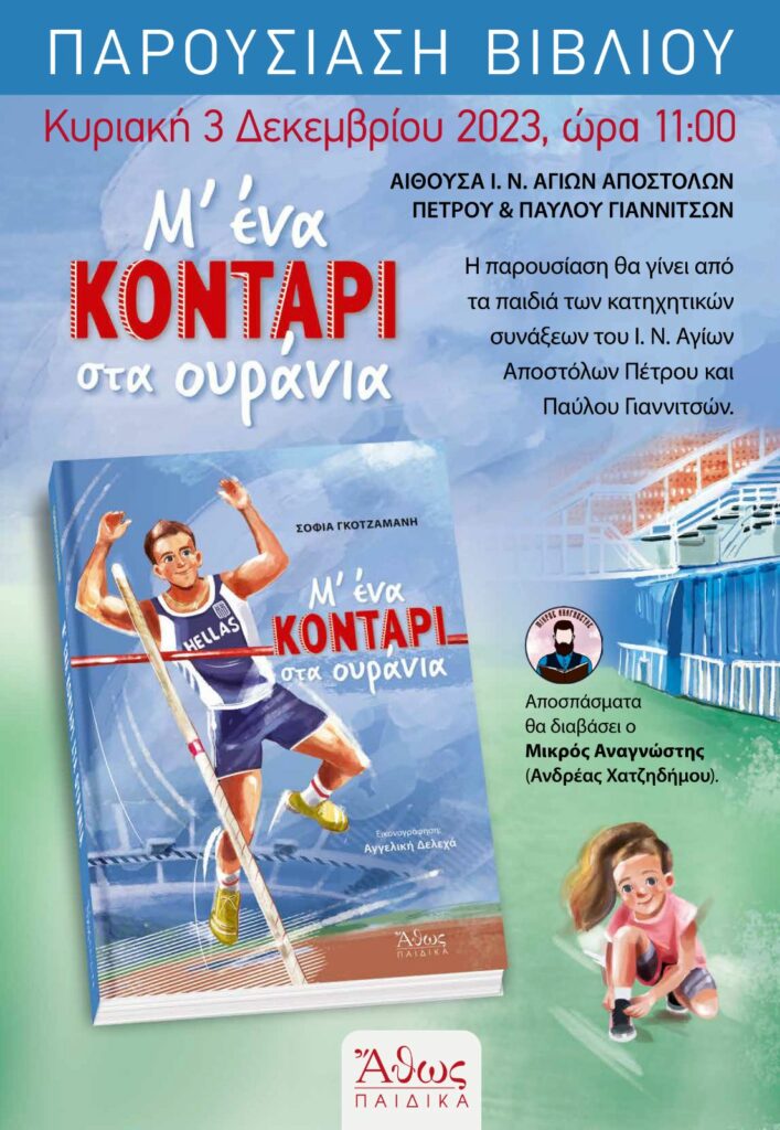 Την Κυριακή 3 Δεκεμβρίου 2023, στις 11.00 π.μ., τα παιδιά των Κατηχητικών Συνάξεων της ενορίας Αγίων Αποστόλων Πέτρου και Παύλου Γιαννιτσών θα παρουσιάσουν στην αίθουσα εκδηλώσεων του Ι. Ναού το βιβλίο «Μ᾿ ένα κοντάρι στα ουράνια», της κατηχήτριας Σοφίας Γκοτζαμάνη.