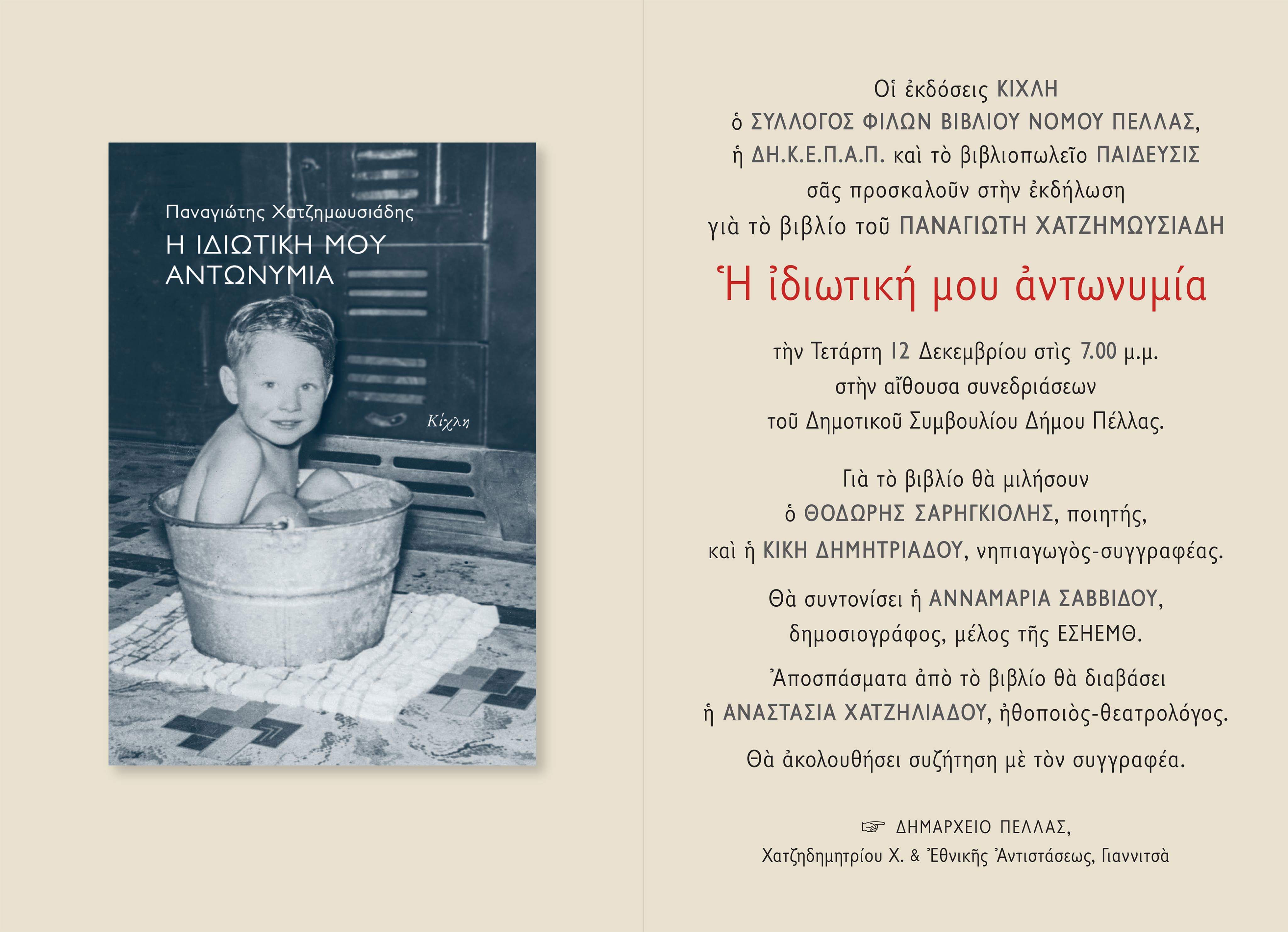 Τετάρτη 12 Δεκεμβρίου, Δημαρχείο 7μ.μ. – “Η ΙΔΙΩΤΙΚΗ ΜΟΥ ΑΝΤΩΝΥΜΙΑ” το νέο βιβλίο του Παναγιώτη Χατζημωϊσιάδη