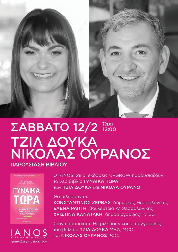 Το Σάββατο 12 Φεβρουαρίου στις 12:00 η Αλυσίδα Πολιτισμού και οι εκδόσεις UPGROW διοργανώνουν παρουσίαση του βιβλίου αυτοβελτίωσης με τίτλο, «Γυναίκα Τώρα» των Τζιλ Δούκα και Νικόλαου Ουρανού.