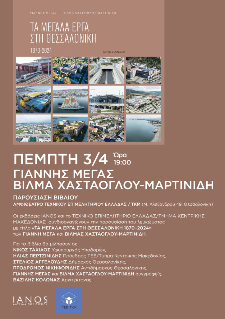 Την Πέμπτη 3 Απριλίου, στις 19:00 η Αλυσίδα Πολιτισμού IANOS και το Τεχνικό Επιμελητήριο Ελλάδας/Τμήμα Κεντρικής Μακεδονίας ,συνδιοργανώνουν παρουσίαση του βιβλίου του Γιάννη Μέγα και της Βίλμας Χαστάογλου – Μαρτινίδη, με τίτλο : «Τα μεγάλα έργα στη Θεσσαλονίκη 1870 – 2024».