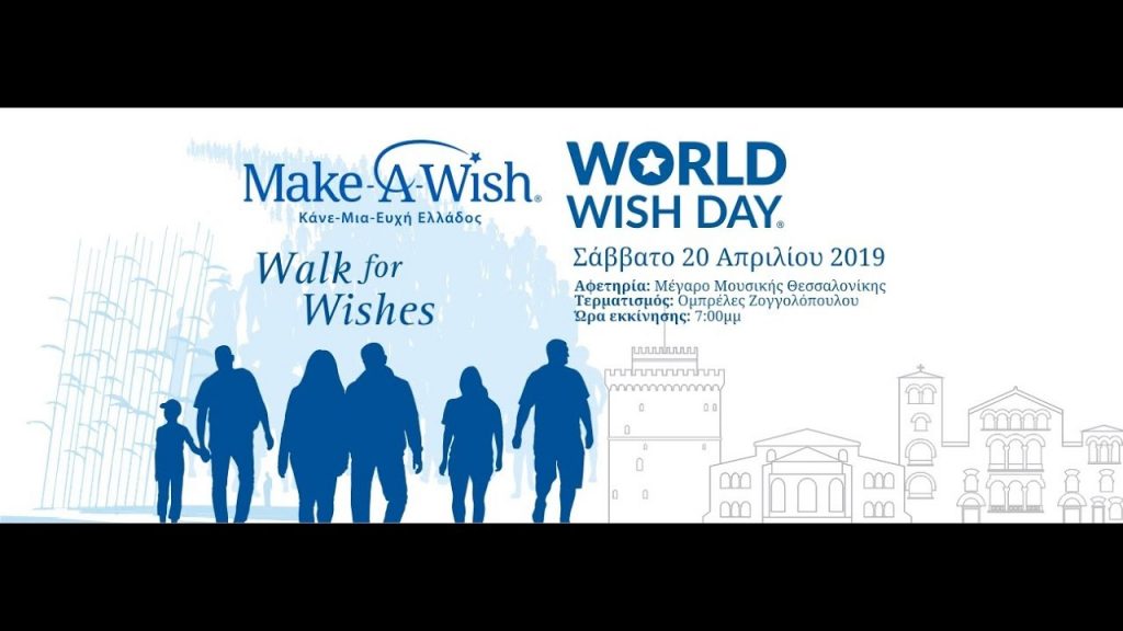 Ο φιλανθρωπικός οργανισμός “Make-A-Wish”(«Κάνε-Μια-Ευχή Ελλάδος») γιορτάζει την Παγκόσμια Ημέρα Ευχής το Σάββατο 20 Απριλίου 2019 μαζί με τα υπόλοιπα παραρτήματά του σε 50 χώρες σε όλο τον κόσμο και διοργανώνει τον πιο φωτεινό Περίπατο Ευχών, στη Νέα Παραλία Θεσσαλονίκης, υπό την αιγίδα της Περιφέρειας Κεντρικής Μακεδονίας.