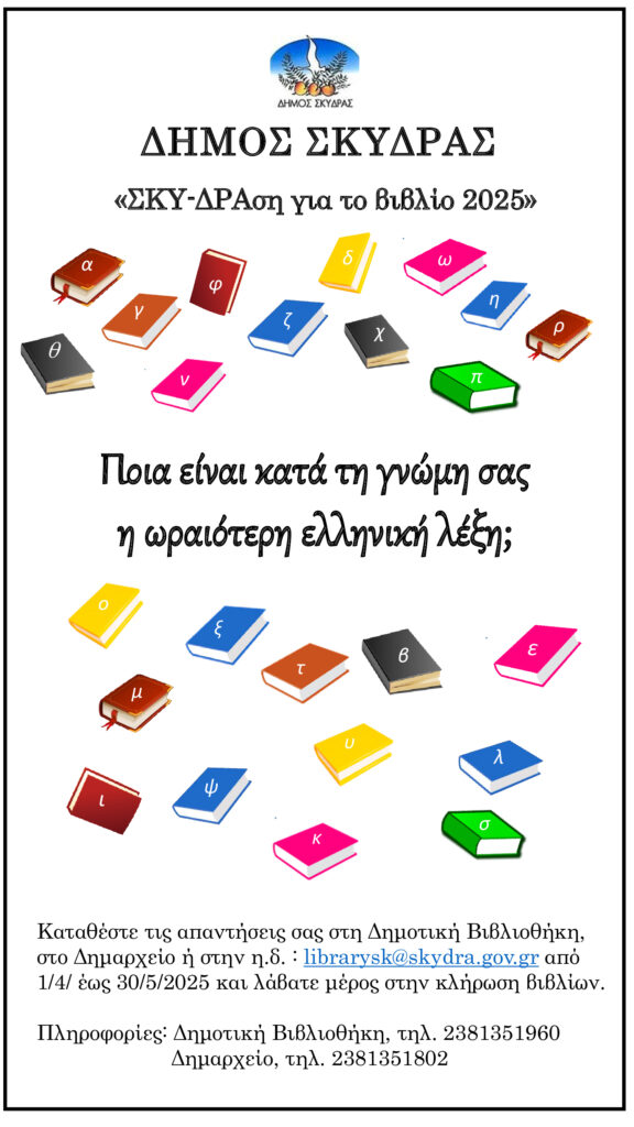 Με σκοπό τη διάδοση και την προαγωγή του βιβλίου ο Δήμος Σκύδρας πραγματοποιεί κάθε χρόνο δράσεις κι εκδηλώσεις, όπως η φετινή «ΣΚΥ-ΔΡΑση για το βιβλίο 2025».
