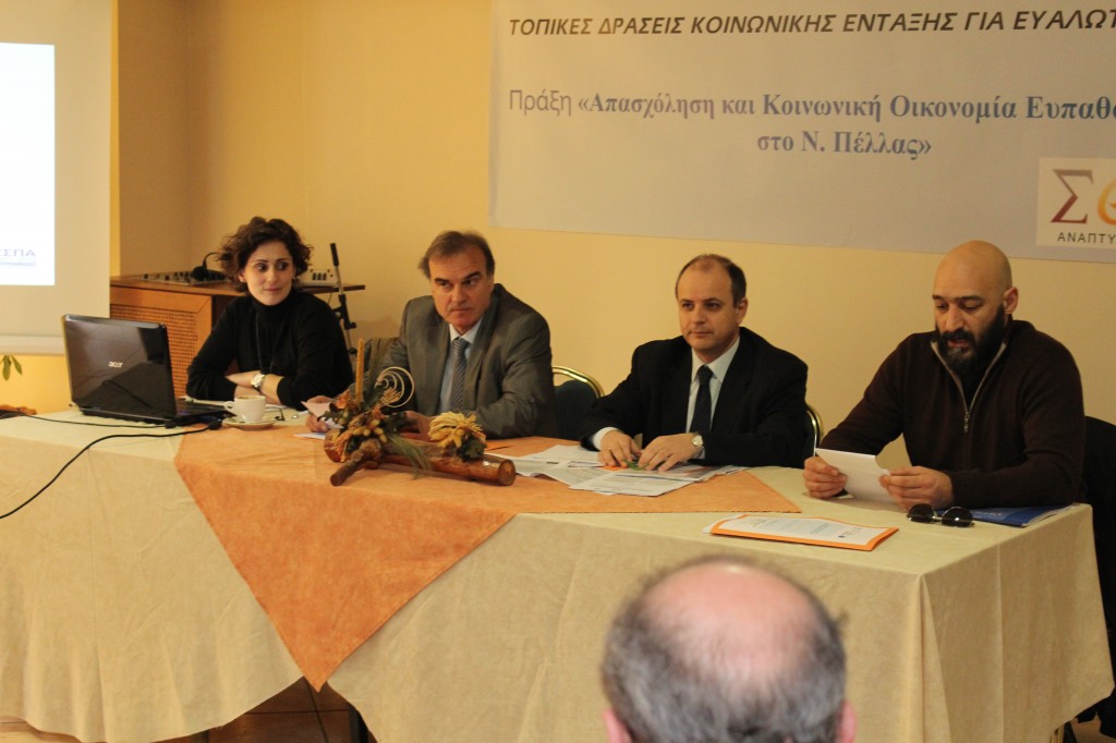 Στην πόλη των Γιαννιτσών πραγματοποιήθηκε στις 23/2/2014 η ημερίδα που διοργανώθηκε από την Αναπτυξιακή Σύμπραξη “ΑΠΑΣΧΟΛΗΣΗ ΕΥΠΑΘΩΝ ΚΟΙΝΩΝΙΚΑ ΟΜΑΔΩΝ Ν. ΠΕΛΛΑΣ” (Α.Σ. ΣΕΠΑ) στα πλαίσια της Πράξης «Απασχόληση και Κοινωνική Οικονομία Ευπαθών Ομάδων στο Ν. Πέλλας» με θέμα την «Κοινωνική Επιχειρηματικότητα».