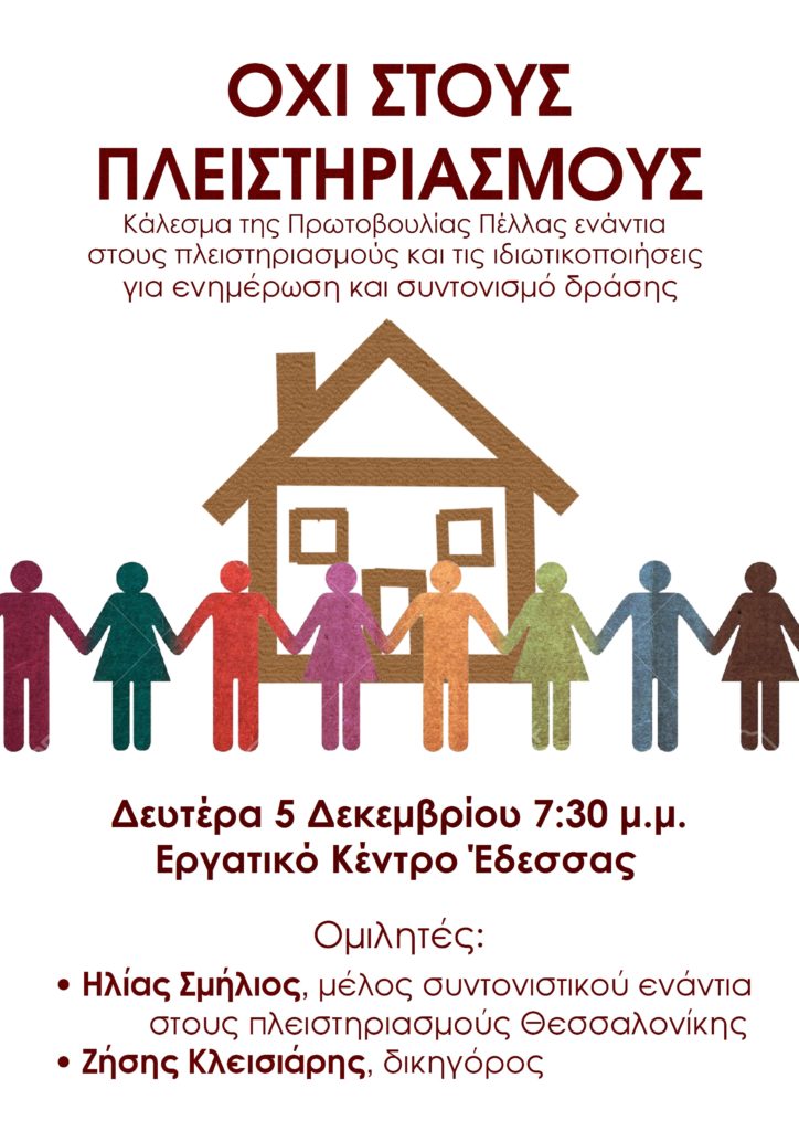 Πρωτοβουλία Πέλλας Ενάντια στους Πλειστηριασμούς και τις Ιδιωτικοποιήσεις Δευτέρα 5 του Δεκέμβρη 19:30 αίθουσα Εργατικού Κέντρου Έδεσσας