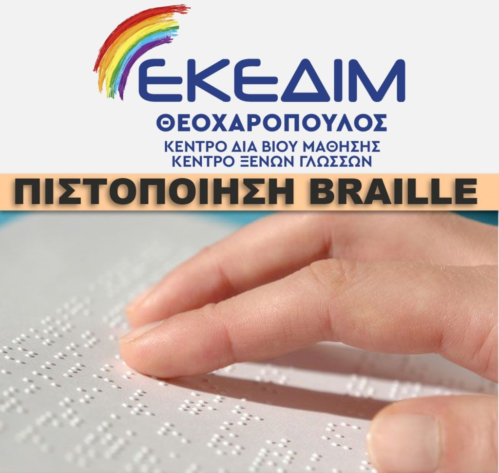 Το ΕΚΕΔΙΜ Θεοχαρόπουλος , στα πλαίσια της συνεργασίας με τον Πανελλήνιο Σύνδεσμο Τυφλών, Περιφερειακή Ένωση Κεντρικής Μακεδονίας, υλοποιεί Θερινά τμήματα εκμάθησης του συστήματος γραφής και ανάγνωσης Braille για τυφλούς με πιστοποίηση.